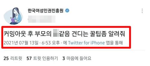 여성가족부 산하 기관인 '한국여성인권진흥원' 트위터에서 당시 위와 같은 발언을 하여 문제가 되었습니다.